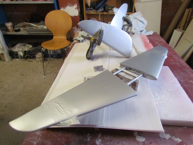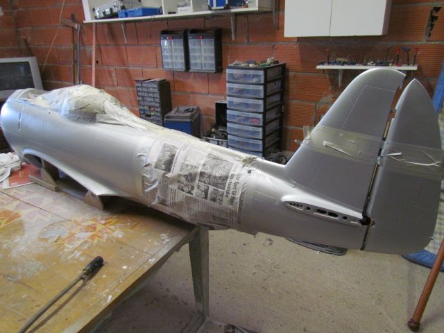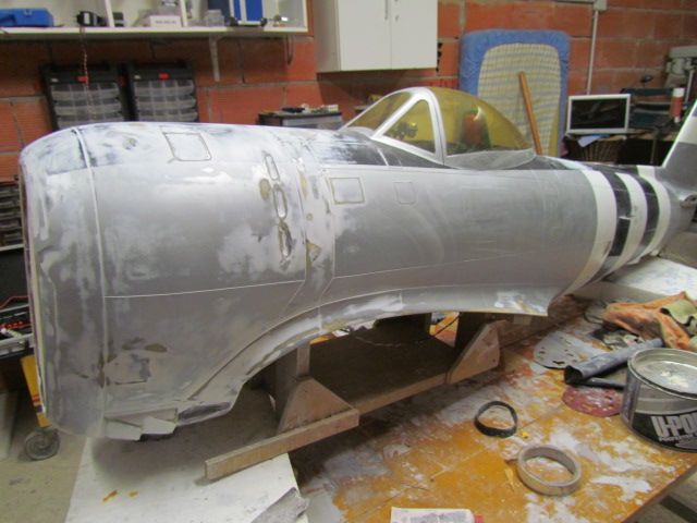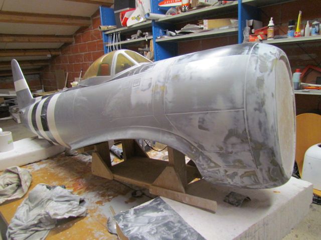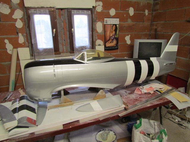 Voici les travaux de réparation d un P-47  en 2,55 mètres d'envergure suite problème de commande,  fuselage, capot, aile et mise en peinture pour moulage et préparation couple moteur pour 3W 75 us."