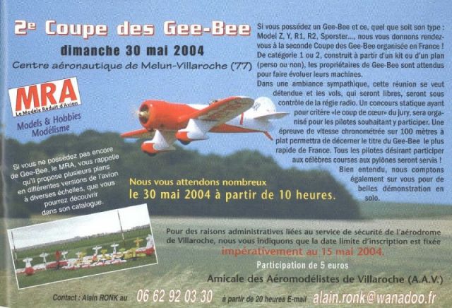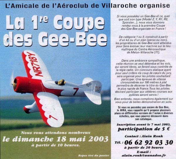 En tant qu'organisateur des deux éditions de la Coupe des Gee-Bee, (2003 & 2004), je doit dire qu'aligner une petite trentaine de Gee-Bee au même endroit et au même moment , c'est quelque chose ! Malheureusement, la météo n'a pas vraiment été au rendez-vous durant ces deux éditions. Néanmoins, tous les pilotes présents ont pu voler et participer aux épreuves programmées.